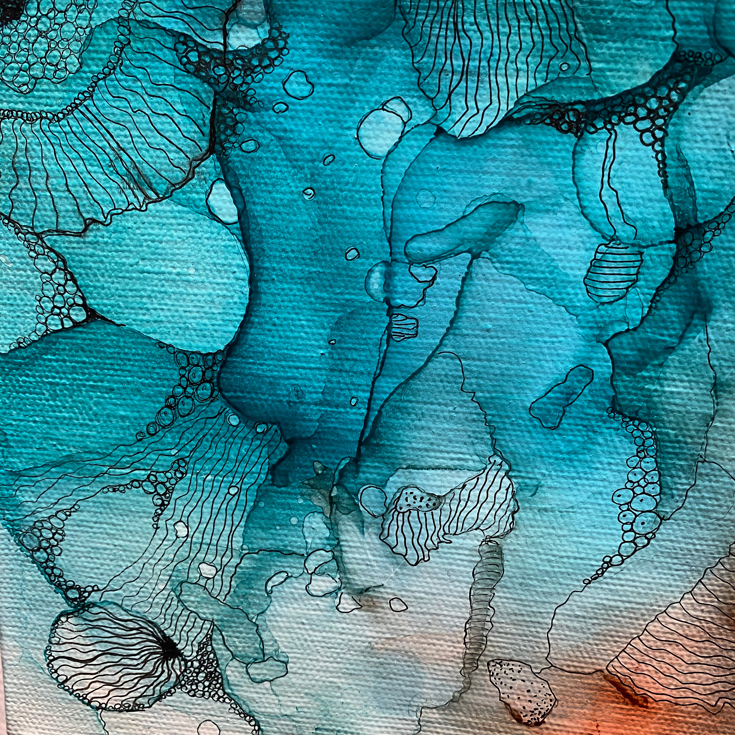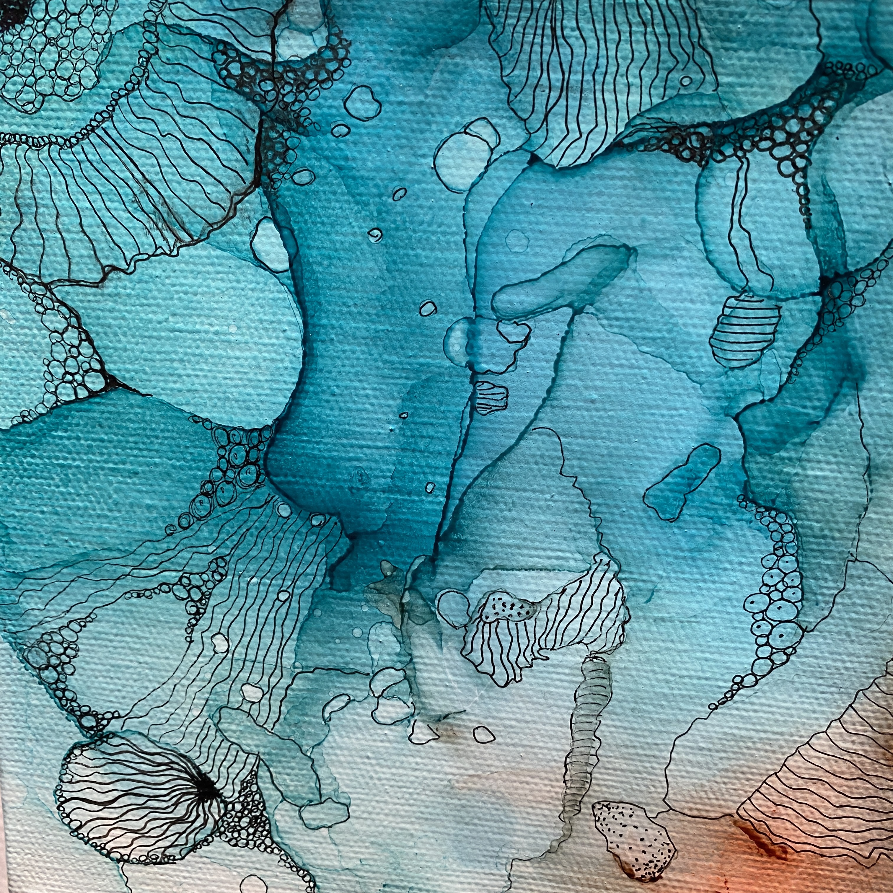 With hair dryer and pump ink will be pushed and layered on canvas. Using the Stippling effect (creating small/big dots) we will create blooms and on the final step black/white/silver/gold pen work will be added as final lines. Canvas size: 11by 14 in or 12 by 12 in